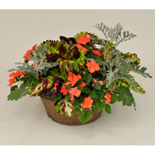 Coleus Mosaic, impatiens salmon, dusty silver dust
